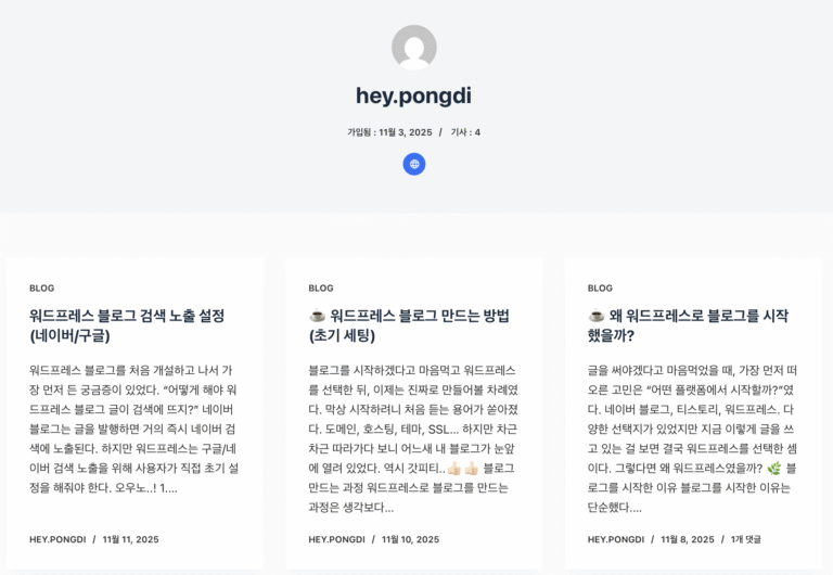 워드프레스 블로그를 처음 만들고 글을 발행해 보면,다른 블로그 플랫폼과 다른 점을 쉽게 찾을 수 있는데 그중 하나가 바로 “작성자 이름” 표시 방식이다. 왜 이메일 주소가 노출될까? 위 이미지와 같이 작성자 이름 영역에 워드프레스를 가입할 때 사용한 이메일 계정이 노출되는 걸 볼수…