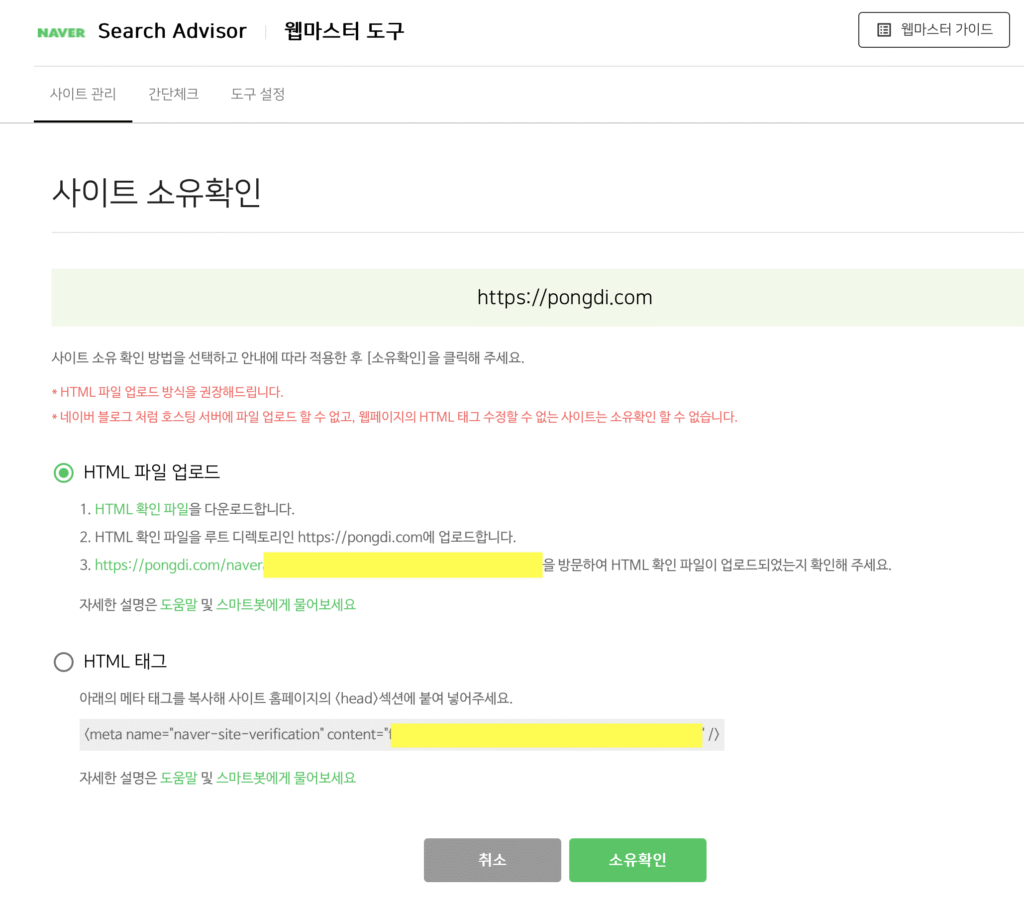 - 네이버 서치 어드바이저에서 다운로드 받은 html 파일을 업로드 해주면 끝!