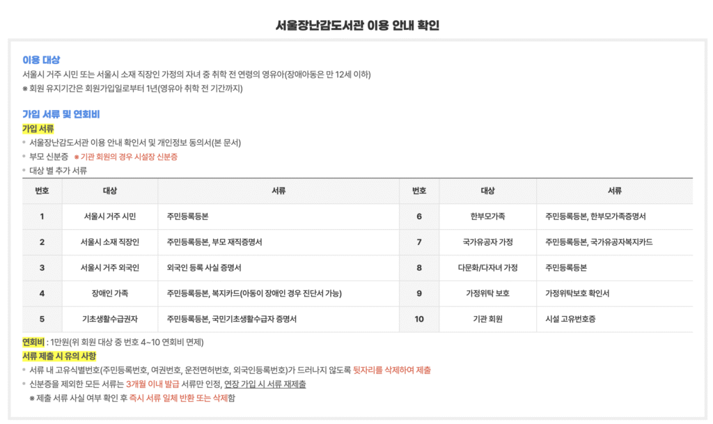 가입 서류는 대상 별로 다른데 나는 서울시 거주 시민이라 주민등록등본과 부모 신분증을 등록하면 됐다.